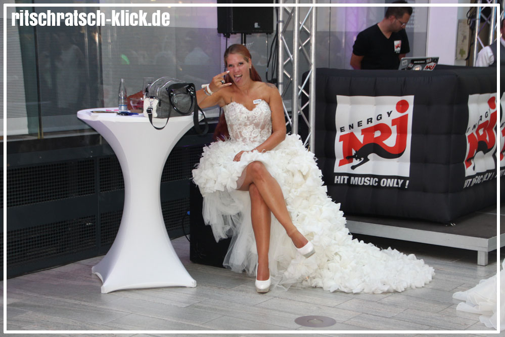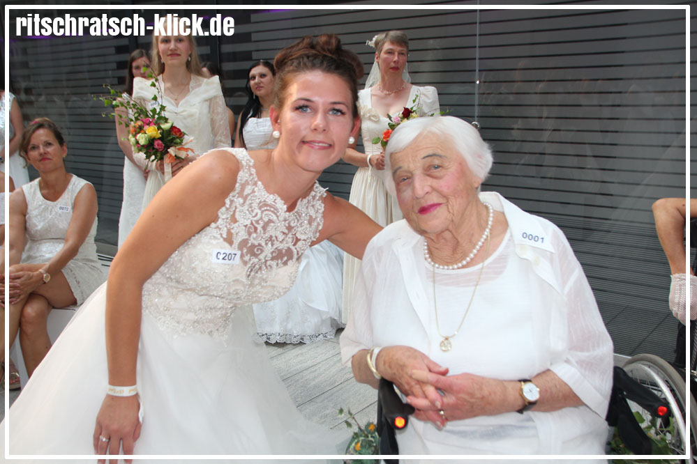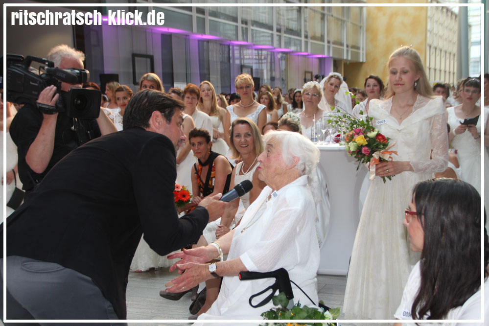 Moderator Marco Schreyl unterhält sich mit Frau Butz, die vor 61 Jahren ihrem Mann das Ja-Wort gab.Sechs Tage gegen 61 Jahre Eheleben. Im Volksbankhaus trafen Bräute mit den unterschiedlichsten Geschichten aufeinander.Oft wurden die Mobiltelefone zum Fotografieren gezückt. Da kann es schon mal passieren, dass man versäumt, dass man von einem Traummann beobachtet wird…Auch ein Bild mit Seltenheitswert: Ursula Volkmann heiratete vor 55 Jahren und holte ihr Hochzeitskleid gerne noch einmal aus dem Schrank, um mit ihrer Tochter Tatjana (Mitte) am Rekordversuch teilzunehmen.